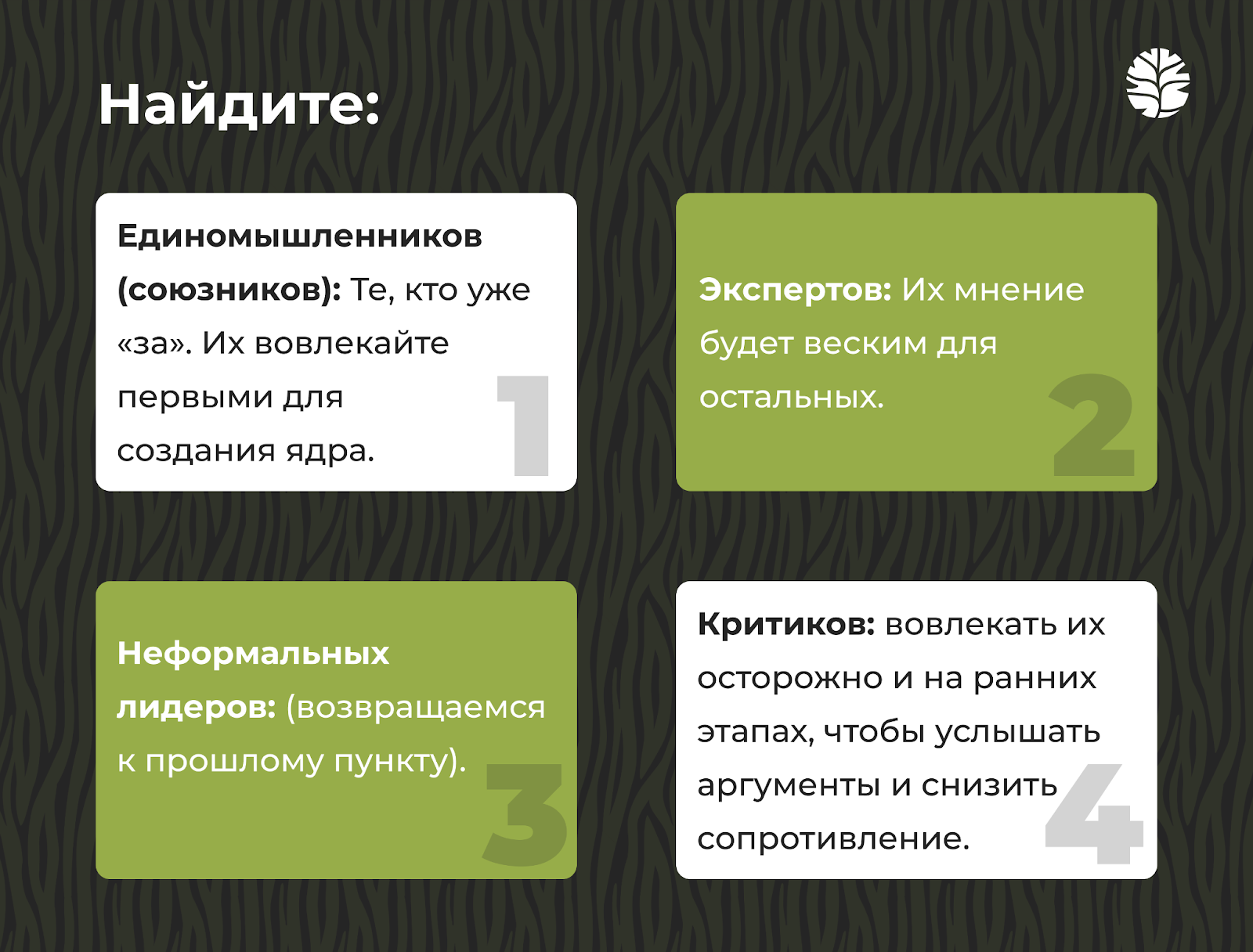 - Вовлечь, а не победить: Дать важную, публичную роль в проекте изменений. Сделать его союзником, а не врагом. Спросить совета. Перевести энергию сопротивления в энергию созидания.
