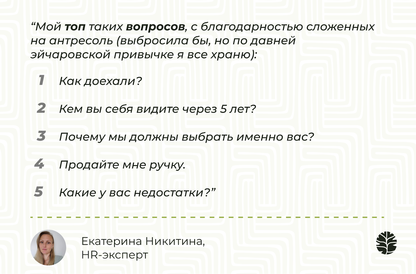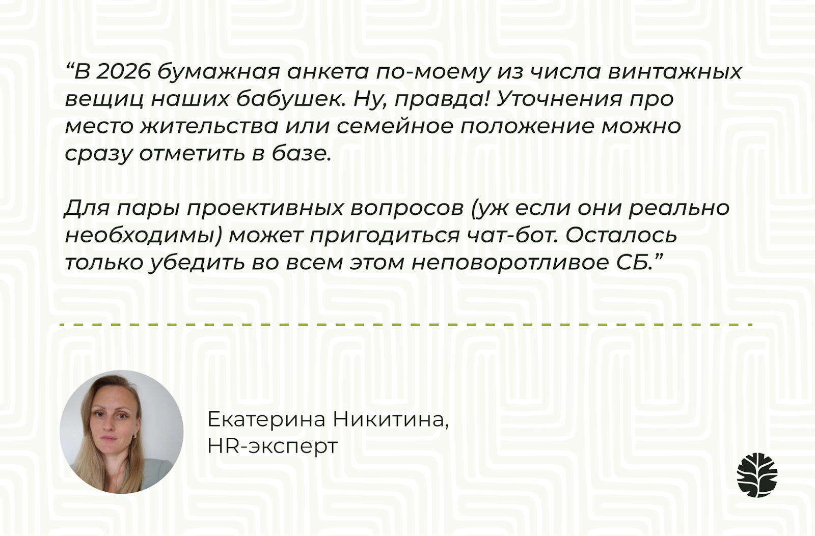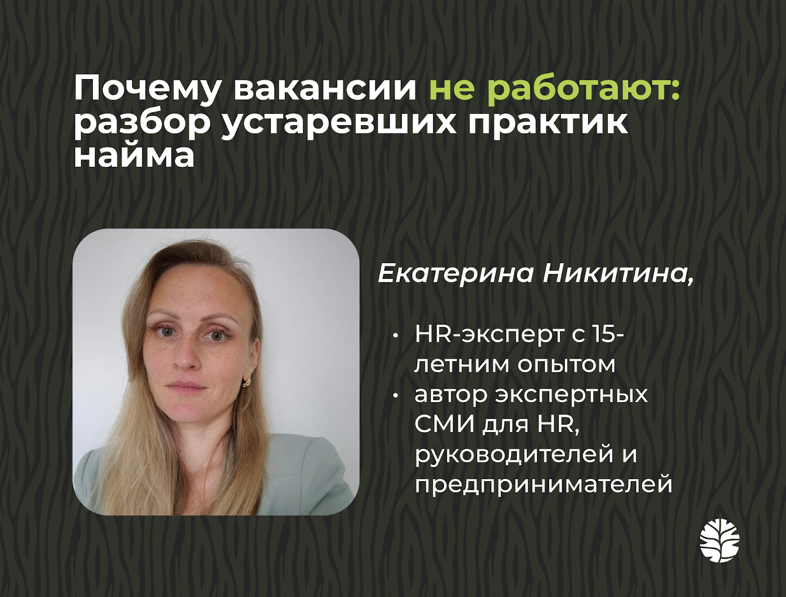 Сегодня своей экспертизой делится Екатерина Никитина — HR-эксперт, автор сообщества неравнодушных HR и менеджеров HRPROSVET, а также собственного Telegram-канала Ekarerina_HR_ notes, в которых профессионалы ежедневно обсуждают живые кейсы и тренды управления персоналом. Она прошла путь от начинающего специалиста до признанного эксперта и готова рассказать, какие практики рекрутинга безнадежно устарели.