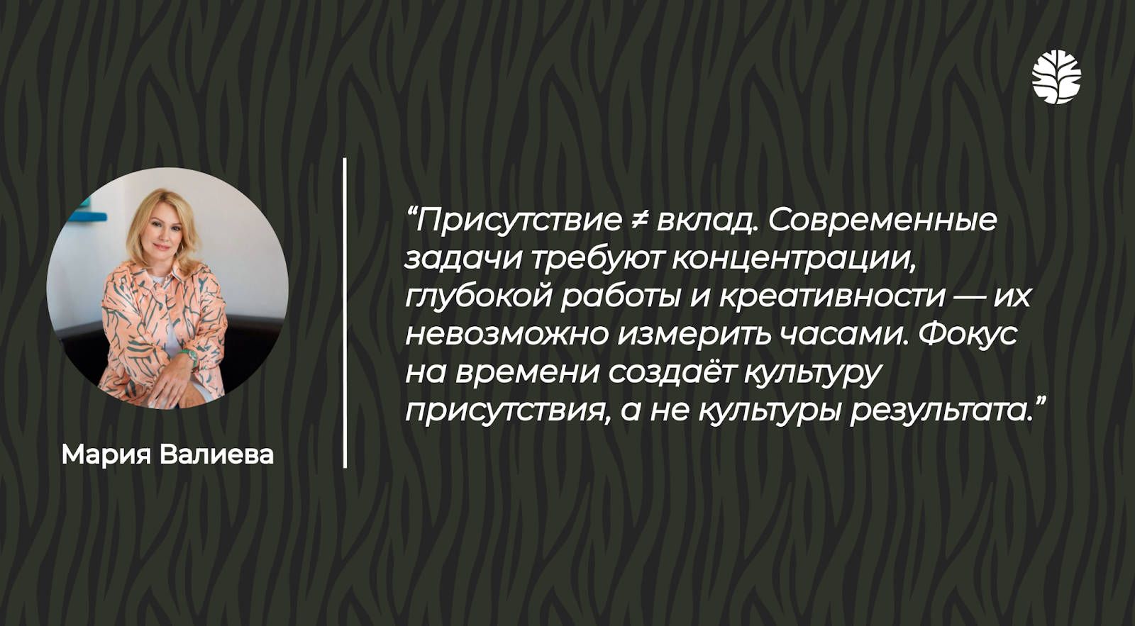 Как отмечает Мария Валиева, результат измеряется созданным ценным продуктом, а не временем присутствия за монитором. Когда внимание руководителя смещается с «сколько» на «что и зачем», меняется сама культура работы.