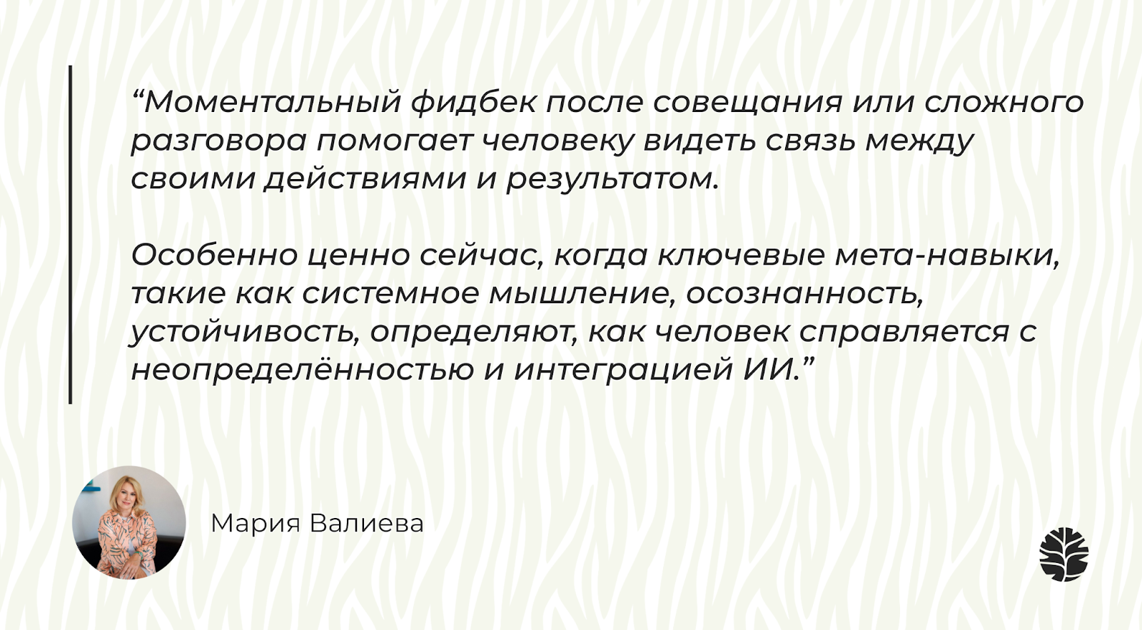 По мнению эксперта, обратная связь должна быть встроена в ежедневную работу. Короткие циклы диалога, обсуждение после проекта или совещания позволяют сотруднику видеть связь между своими действиями и результатом в реальном времени.