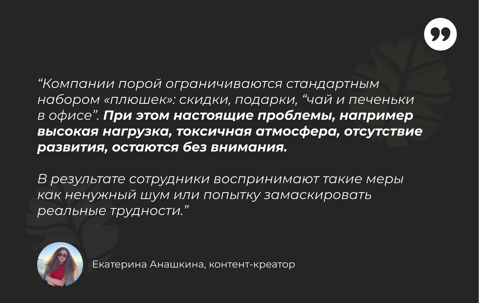 Что делать: Сначала выявить болевые точки (стресс, выгорание, перегрузка), а потом выстраивать well-being вокруг устранения этих факторов. Бонусы и допльготы должны быть только частью, а не основой программы.