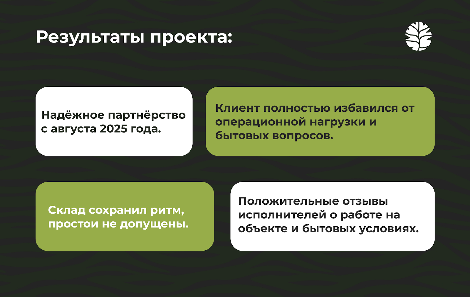 - Обеспечили дополнительные услуги: организовали питание и трансфер до склада, сняли обжещитие — это помогло обеспечить комфортный ритм работы и восстановления.